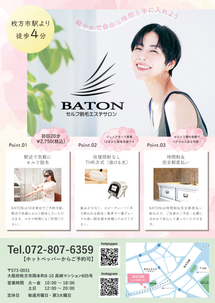 Flyer / 枚方市にあるセルフ脱毛サロンBATON様のチラシデザインを制作させていただきました。(クライアントワーク)