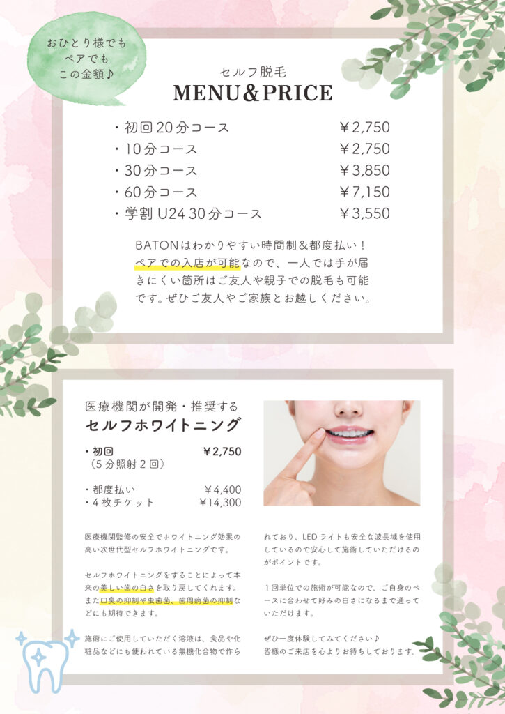 うら面は、「メニューと料金表」「セルフホワイトニング」のご案内を掲載。脱毛メニューには「ペアでの入店ができること」と「おひとり様でもペア入店でも金額が変わらないこと」を下線と吹き出しで強調しました。